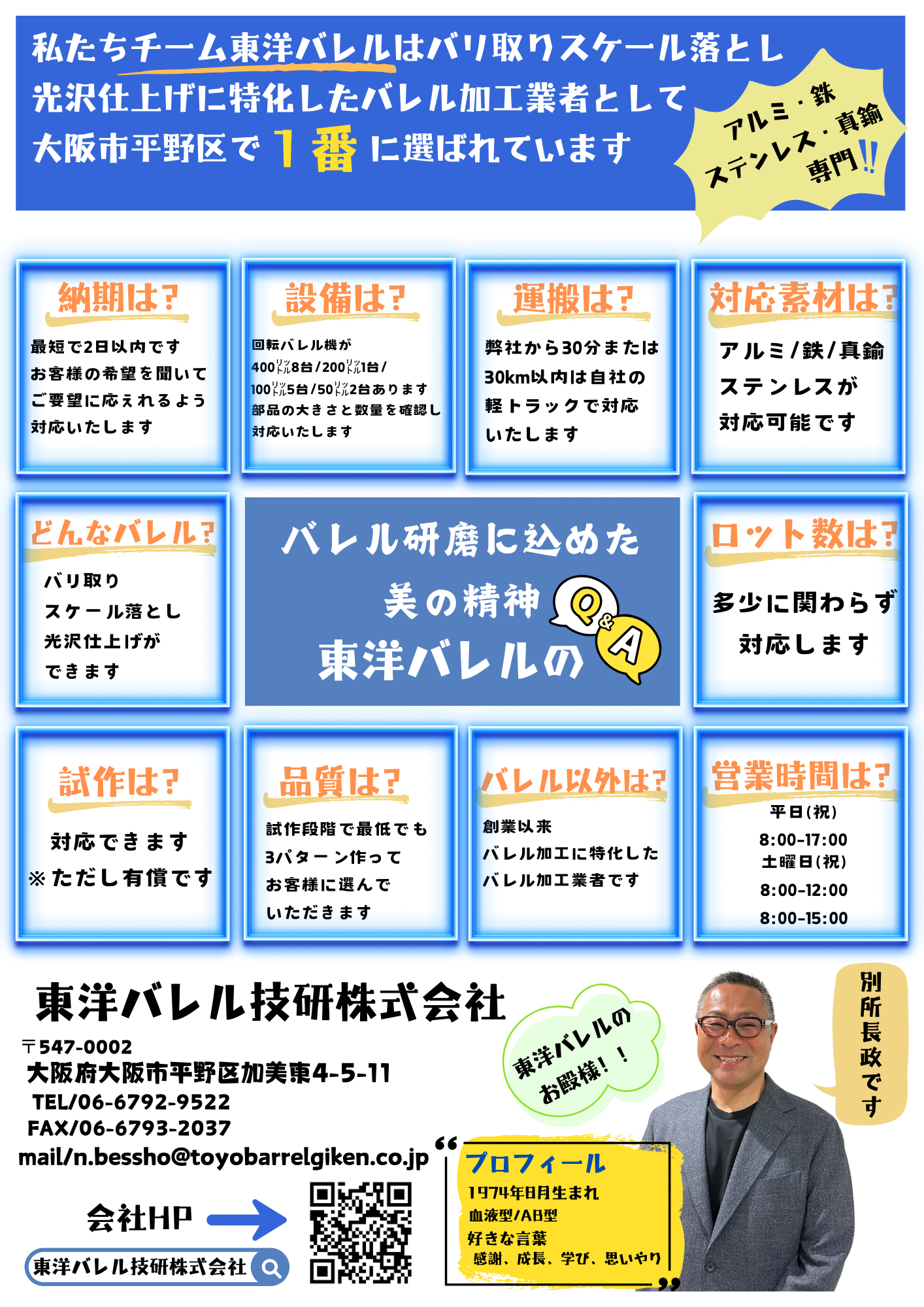 大阪市平野区加美東から、国内市場はもとより世界市場までも視野に入れ、中小企業、中小製造業、中小製造メーカーの業務効率化を力強く支える、そんな唯一無二の存在として、大阪南東エリアNo.1の指名を受けるバレル研磨加工業者になることを、私は本気で、心の底から願い、目指します。 1977年10月1日、父はかつて勤めていた化学薬品メーカーのバレル事業部を買い取り、大阪市平野区加美正覚寺の地で東洋バレル技研株式会社を創業しました。その創業精神は「東洋一のバレル業者として、海を渡り、世界へ羽ばたく」。この言葉を胸に、父は30年にわたり、輸送用機器メーカーの協力工場として日本のものづくりを支えてきました。2013年、70歳という若さで他界しましたが、その志は今も私の中に強く生き続けています。 私は2001年に入社し、現場・営業で経験を積んだ後、2007年に代表取締役に就任しました。しかしその直後、リーマンショックによる経済の大波に襲われ、第二工場の閉鎖やリストラなど苦渋の決断を強いられました。 2010年には資金繰りが悪化し、倒産寸前にまで追い込まれました。それでも私は諦めませんでした。「一社依存からの脱却」を胸に、再建に立ち向かい、地道な改革を続けました。 その努力が実を結び、2019年には依存体質から脱却。2021年にはすべての債務を正常化し、2024年12月の決算時点では年間約60社との取引実績を築けるまでに回復しました。 私たちのバレル研磨とは、製品に命を吹き込む工程です。人が安全に触れられるようにバリを取り、表面処理の効果を最大化するためにスケールを除去し、そして製品に美しさと価値を加えるために光沢を仕上げる。そのすべてに、確かな技術と誇りがあります。 私の心からの願望、それは子どもから大人まで誰もが安心して触れられる製品をつくり、錆びにくく、美しい外観を誇る製品を届けることで、必ずや大阪南東エリアで最も信頼され、最も指名される企業になること。そして、「高収益」「高賃金」を実現する町工場として、地元の子どもたちが憧れ、教育機関からも推薦される“地域で一番働きたい企業”になることです。 私は、この想いを決して揺るがせることなく、これからも真っ直ぐに突き進んでまいります。