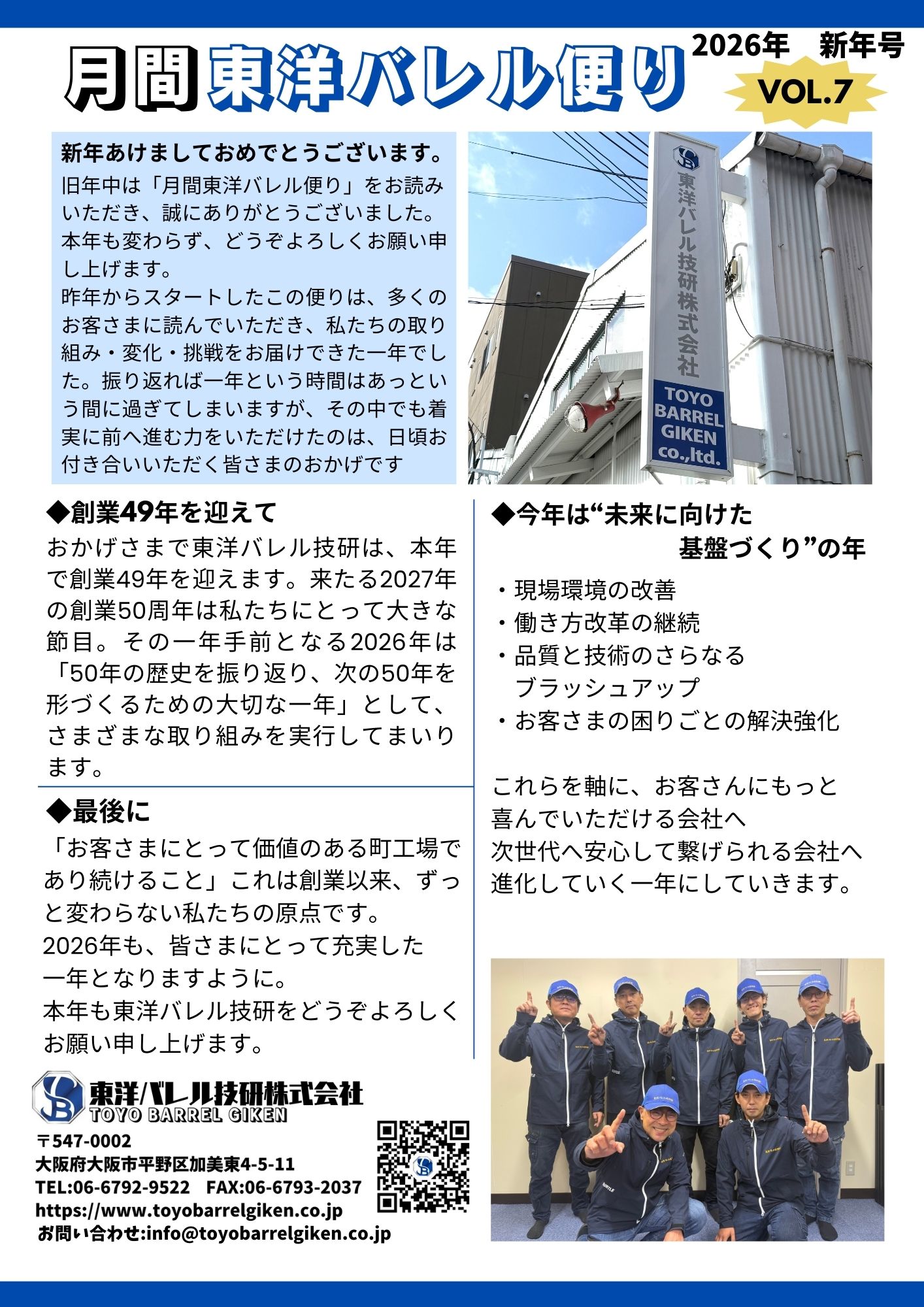 東洋バレル技研株式会社は、1977年10月1日、大阪市平野区加美正覚寺にて故・別所正章が創業いたしました。以来、地域に根ざしながらも「東洋一のバレル業者として海を渡り、世界に羽ばたく」という創業の精神を胸に、ものづくりに取り組んでまいりました。 今年、当社は創業48年を迎え、いよいよ50周年の節目が目前に迫っております。ここまで歩んでこられたのは、社員とそのご家族をはじめ、⾧年ご愛顧いただいているお客さん、仕入先や外部支援機関の皆さま、そ して地域の方々の温かいご支援とご協力の賜物に他なりません。この場を借りて、心より感謝申し上げます。 私たち「チーム東洋バレル」は、町工場という枠にとらわれることなく、常に挑戦と進化を続けております。お客さんの課題に真摯に向き合い、「購買決定権100%はお客さんにある」という基本姿勢を忘れることなく、最適な解決策を共に考えるパートナーとして信頼される企業を目指しています。 また、行動規範として掲げる「時代の変化に心を開く」という言葉のとおり、変化を恐れず柔軟に対応しながら、技術とサービスのさらなる向上に努めてまいります。 今回の知的資産経営報告書の作成にあたっては、社員一人ひとりと共に、当社の強みやお客さんから選ばれる理由、提供する価値についてあらためて見つめ直しました。この過程は、私たちが50周年に向けてより一層の飛躍を遂げるための大きな一歩であると確信しております。 今後とも、東洋バレル技研株式会社に変わらぬご支援を賜りますよう、何卒よろしくお願い申し上げます。