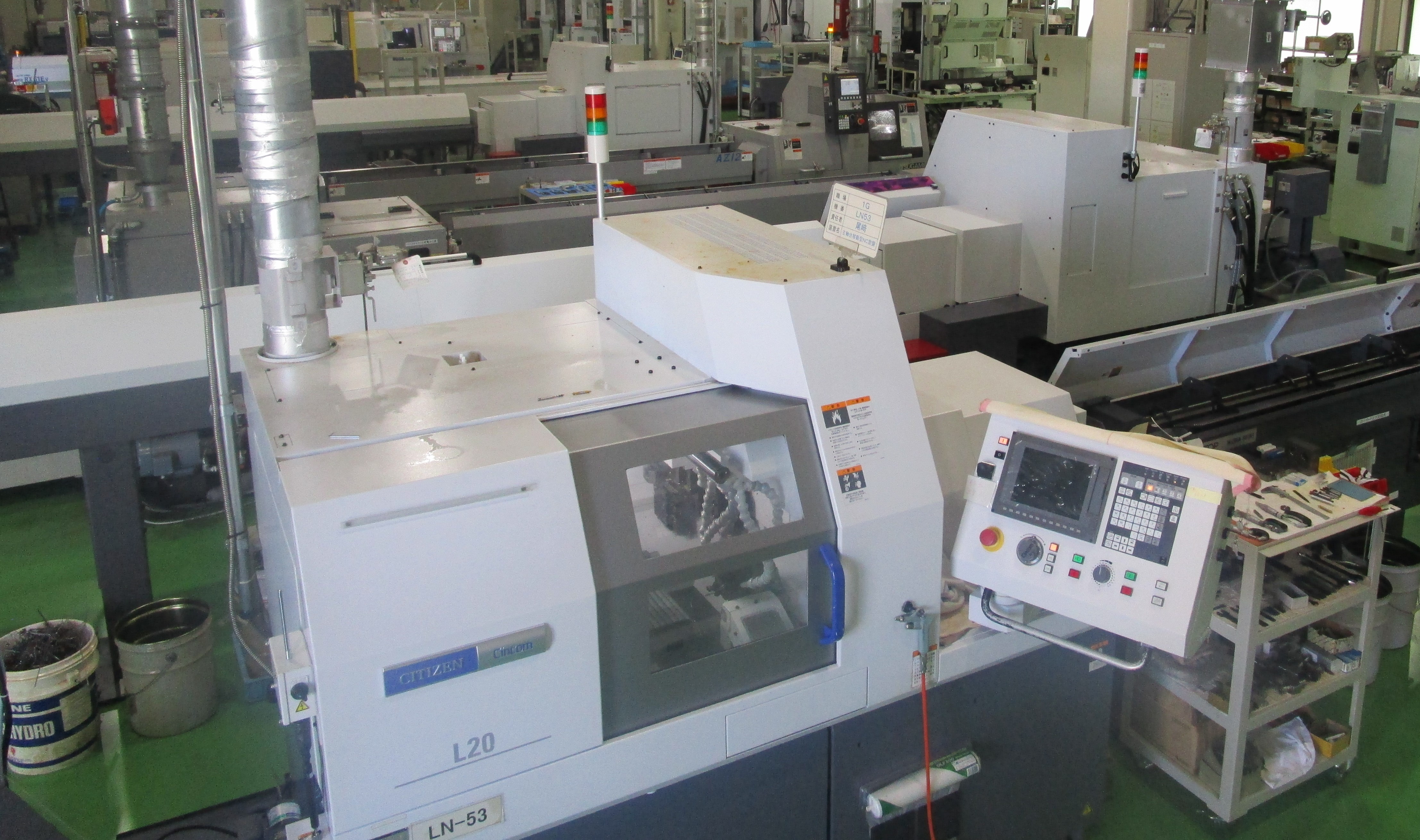 NC旋盤(棒材供給機仕様) 【2スピンドル機】 φ2~φ5 ツガミB007 2台 φ3~φ12 シチズンL12 2台 / ツガミB012 3台 ・B0125 7台 φ3~φ16 シチズンA16 1台 φ3~φ20 シチズンL20 7台 シチズンA20 3台 / ツガミBS20 2台 ・BW20 1台 φ8~φ34 シチズン(ミヤノ)BND-34S5 1台 ・BNE-34S3 1台 φ8~φ42 シチズン(ミヤノ)BND-42S5 2台 φ8~φ51 BND-51SY2 3台 【1スピンドル機】 φ2~φ12 シチズン(ミヤノ)LS-12C)1台 φ8~φ20/シチズン(ミヤノ)BNB-34C 1台 φ8~φ34/シチズン(ミヤノ)BND-34C 1台 NC旋盤(パーツフィーダー仕様) 【チャッカーマシン】 シチズン(ミヤノ)GN3200W 1台 ・RL01 4台 ・LZ-0 1台 ツガミBS-12 2台 マシニングセンタ 【横型】 松浦PC-11 BT40 11面仕様パレットチェンジャー ・H-PLUS-300 BT40 15面仕様パレットチェンジャー 松浦H-PLUS-300 BT40 5面仕様パレットチェンジャー 【縦型) メクトロンMTV-T460 BT40 専用パレットストッカー仕様 7台 研削盤 【芯なし研削盤】 大宮マシナリー OC-18BR-150型 加工範囲φ1~φ40 550L 12-A型(パーツフィーダ仕様) 加工範囲φ1~30φ 100L 2台 【円筒研削盤】 シギヤ精機 GPS-30B50 最大加工径φ40 最大加工長300mm 2台 【平面研削盤】 日興精機 NSG-520H 最大ストローク量 横450mm 縦150mm 岡本工作機械 PSG63DXNC GRID-X 最大ストローク量 横750mm 縦350mm 冷間圧造機(ヘッダー) トリマー機 1台 ローリングマシン 1台 φ2~φ5 中島田鉄工所 NP60 :1D2B 1台 六角穴プレス機 1台 自動スリ割り機 3台 φ3~φ7 中島田鉄工所 MF140:2D3B 1台 φ7~φ8.5 小園製作所 KH・B2 :1D2B 1台 真空浸炭炉 不二越 1基 焼き戻し炉 不二越 1基 サーマル 1基 バレル機 4台 ショットブラスト機 不二越 2台 黒染め装置 1台 炭化水素真空洗浄機 アクア化学 1台
